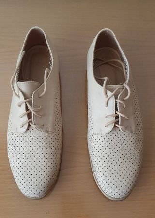 Zapatos de mujer con cordones y un diseño perforado. - Color beige. - Tienen leves signos de desgaste por el uso, pero están en muy buen estado. - Precio original 29,99€. - Se entregan con su caja.