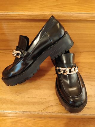 Elegantes zapatos negros con detalle de cadena dorada. - Diseño tipo mocasín. - Suela gruesa y moderna. - Acabado brillante.
