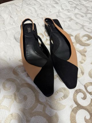 Elegantes zapatos destalonados de Zara. - Diseño bicolor en beige y negro. - Punta cuadrada. - Tira elástica en el talón.