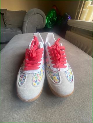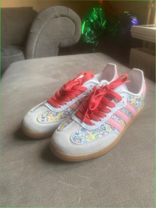 Zapatillas Adidas Samba con un diseño floral Liberty London. El modelo combina blanco y rosa con cordones a juego. - Detalle de estampado floral. - Tres rayas laterales en rosa. - Suela de goma. - Talla 37.
