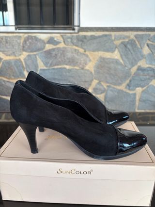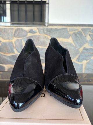 Elegantes tacones de ante negro con puntera de charol brillante. Un diseño sofisticado para cualquier ocasión. - Tacón de aguja. - Corte asimétrico.