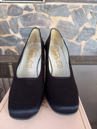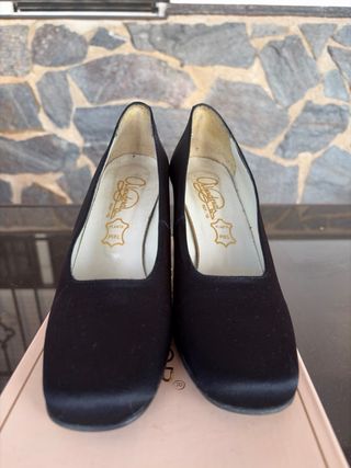 Zapatos de salón con acabado en satén, cierre de pulsera al tobillo, en muy buen estado. Tacón finito de 6'5 cm