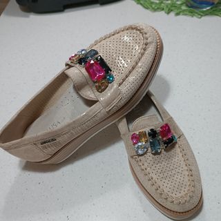Preciosos zapatos planos de la marca AnnaLisa. Ideales para un look casual y elegante. - Diseño de mocasín con perforaciones. - Decorados con brillantes piedras de colores. - Color beige dorado. Usados en una sola ocasión.