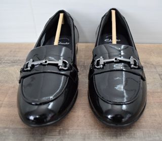 - Mocasines de charol con detalle metálico de la marca Clarks, modelo Finja Loafer. Talla 38. - Diseño elegante y moderno. Acabado brillante. Detalle de hebilla metálica en la pala. - Totalmente nuevos, sin uso.