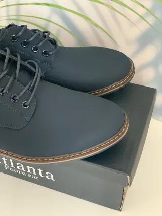 Zapatos tipo derby de serraje azul marino, con costuras en contraste y suela de goma marrón. Muy combinables con vaqueros o chinos para vestir informal. Estado bueno: el serraje está cuidado, sin rotos ni descosidos; la suela tiene un desgaste mínimo de uso (se ve en las fotos).