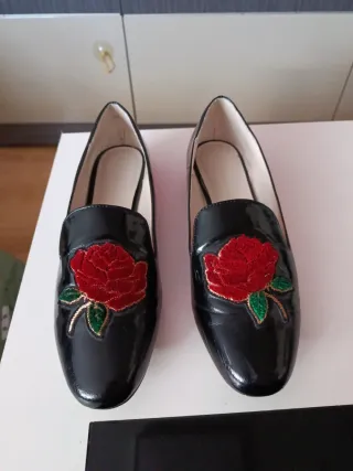 Elegantes zapatos planos con un diseño único. - Acabado brillante. - Detalle bordado de rosa roja en el empeine. - Diseño de punta fina. - Usados una sola vez