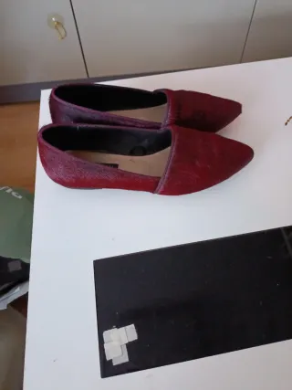 Zapatos de cuña con detalle de esparto. - Material exterior de tela azul. - Cuña forrada de esparto. - Diseño de punta fina. Me los compré ya que me parecía muy fáciles de combinar y tacón cómodo pero ya me estaban grandes, pensaba que con una plantilla se iba a arreglar pero no. 1 uso. Me da pena tirarlo
