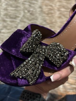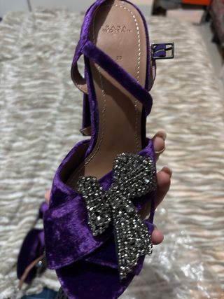 Elegantes zapatos de tacón alto de Zara. - Material de terciopelo. - Adorno de lazo con pedrería. - Cierre de hebilla.
