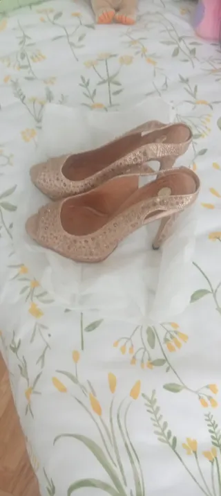 Elegantes zapatos de tacón con un diseño sofisticado. - Acabado en piel con textura de escamas. - Detalle de encaje negro. - Lazos de cinta negra para atar al tobillo. - Punta abierta y puntera reforzada en plateado. - Usados en una ocasión