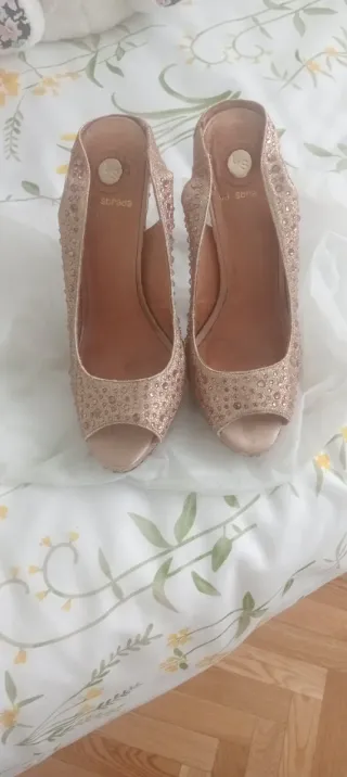 Elegantes zapatos de tacón con detalles brillantes. - Diseño abierto con tiras. - Adornos de pedrería. - Punta metálica dorada.