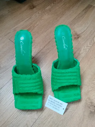 Elegantes zapatos de tacón con un diseño de tiras cruzadas. - Material: Antelina. - Color: Verde. - Cierre: cremallera en zona talón - Tacón: Bloque.