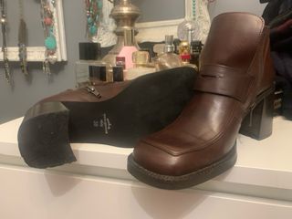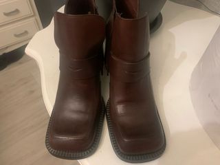 Elegantes zapatos de vestir de piel en color marrón. Perfectos para cualquier ocasión. - Diseño tipo mocasín. - Puntera cuadrada con pespuntes decorativos. - Tacón bajo y cómodo. Muy muy poco uso