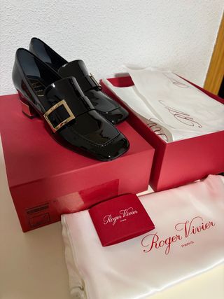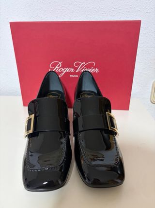 Elegantes zapatos de tacón de charol negro. - Diseño con hebilla dorada. - Tacón metálico dorado. - Talla 37 1/2 o 37.5 - Nuevo sin ningún uso. - Se entrega como en la foto, caja, bolsa de tela, papel seda y tarjeta de la firma. - En caso de envío consultar antes.