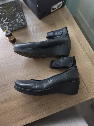 Elegantes zapatos de cuña con un diseño moderno. - Cierre de correa al tobillo. - Material exterior de piel. - Suela de goma.