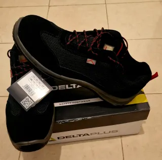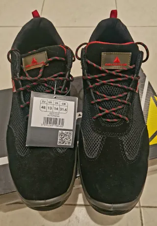 Calzado de seguridad de la marca Delta Plus. - Talla EU 48. - Color negro. - Diseño deportivo con cordones rojos.