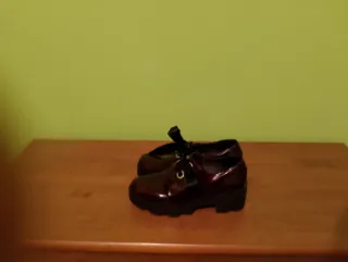 Elegantes zapatos de charol en color granate con un detalle de lazo negro. - Acabado brillante. - Cierre con cordones. - Suela gruesa.