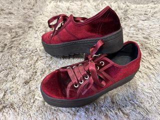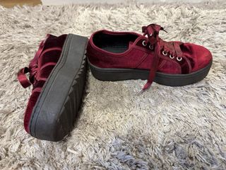 Zapatos marca Victoria de terciopelo burdeos. Cordones de satén y plataforma en sierra. Poco uso.
