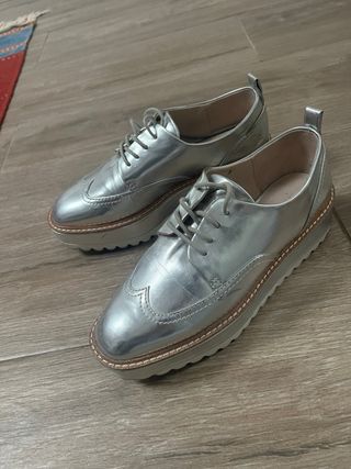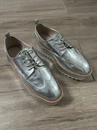 Zapatos estilo Oxford con un acabado metalizado brillante. - Diseño con cordones. - Suela gruesa tipo plataforma. - Detalle de picado en la puntera.