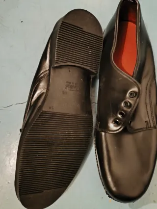 Zapatos negros de piel, completamente nuevos a estrenar. No han sido usados nunca. Características: - Talla: 46 (EU) - Material: piel - Color: negro - Fabricados en España - Suela antideslizante - No incluyen cordones (van así de origen) - Se venden el par completo Ideales como calzado de uniforme, vestir o trabajo. Estado impecable, tal como se aprecia en las fotos. Cualquier duda, pregunta sin compromiso.