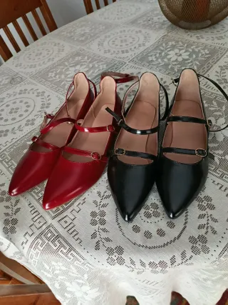Se venden dos pares de zapatos planos para mujer.Para mi son grandes y no los puedo cambiar NO HAGO ENVÍOS /DOS X UNO - Un par en color rojo brillante. - Un par en color negro. - Talla 39. - Diseño de punta fina. - Tiras con hebilla.