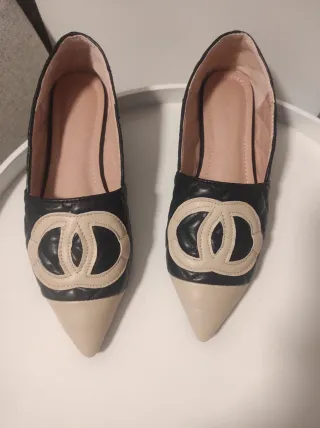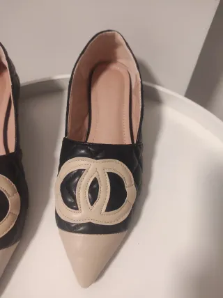 Elegantes zapatos planos para mujer con un diseño bicolor. Nuevos, sin estrenar. - Punta afilada. - Detalle de doble C en la parte delantera. - Acabado acolchado en la zona negra.