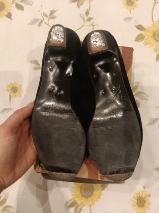 Elegantes zapatos de la marca Mascaró en color negro.Apenas puestos dos veces. Color impecable que no se aprecia en las fotos - Diseño moderno y sofisticado. - Material de ante. - Tacón cuadrado.
