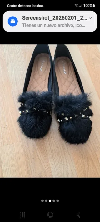 Elegantes zapatos planos de la marca Amesía. - Color negro con detalles dorados. - Adorno de pelo sintético en la punta. - Tachuelas decorativas en la tira.