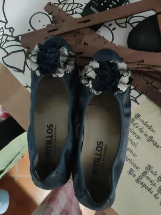 Zapatos planos de la marca Pitillos en color azul, con un detalle de flor decorativa en la parte delantera. - Diseño elegante y cómodo. - Fabricados en España.