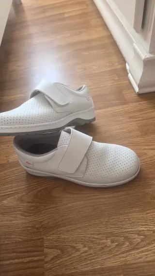 Zapatos de trabajo cerrados de color blanco. - Cierre de velcro. - Suela antideslizante. - Diseño cómodo y funcional.