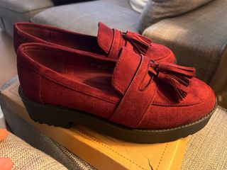 Elegantes zapatos con un poco de plataforma en color granate. - Diseño tipo mocasín. - Detalle de flecos en la pala. - Material tipo ante.