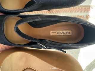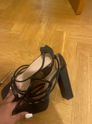 Elegantes zapatos de tacón negros con un diseño moderno. Son súper cómodos. Están en buen estado salvo por el roce interior que tienen en una tira (última foto). - Tacón grueso y plataforma. - Tiras cruzadas en el empeine. - Material de ante.