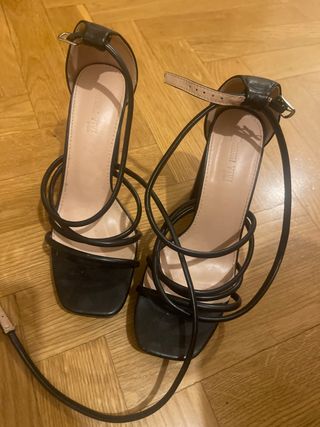 Elegantes zapatos de tacón con tiras finas y cierre de hebilla. - Diseño de tiras finas que se anudan al tobillo. - Tacón grueso y cuadrado. - Punta cuadrada.