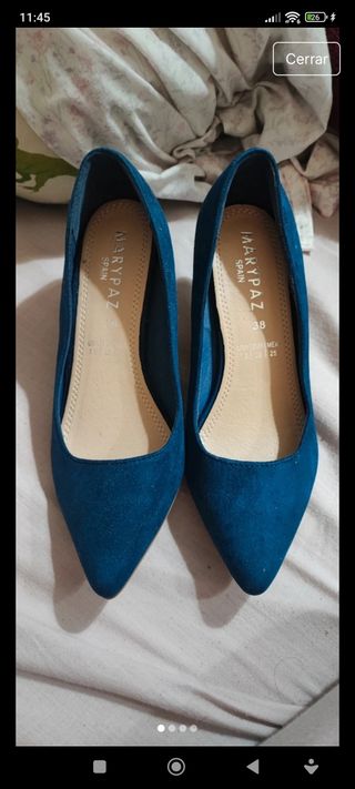 Elegantes zapatos de tacón bajo en color azul petroleo - Marca: MARYPAZ - Talla: 38 EUR - Diseño de punta fina - Material de ante