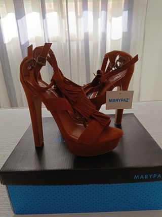 Zapatos tipo zuecos de 10,5 cm de tacón y 3 cm de plataforma, con una costura central, confeccionados en piel de ante color camel. Son muy cómodos. Solo puestos una vez.