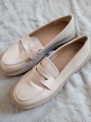 Zapatos planos de estilo mocasín en color beige. - Diseño clásico con antifaz. - Suela gruesa y cómoda. - Detalle de pespuntes.