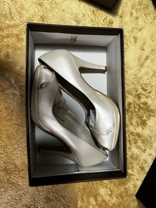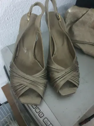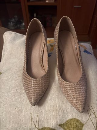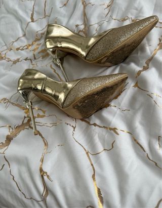 Elegantes zapatos de tacón con un acabado brillante y efecto espejo. - Diseño de punta fina. - Detalle de purpurina en la puntera. - Tacón de aguja metálico. Zapato tipo stiletto en color dorado. Detalle pedrería en el tacón. Efecto espejo. Usados solo una vez. Suela sucia pero el zapato está perfecto. Comprados en Italia, costaron 120€. Mi pie mide 24,5cm