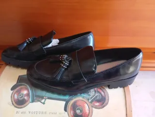 Elegantes zapatos tipo mocasín de Zara. - Acabado brillante. - Detalle de flecos y tachuelas en la pala. - Suela gruesa con relieve.