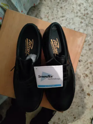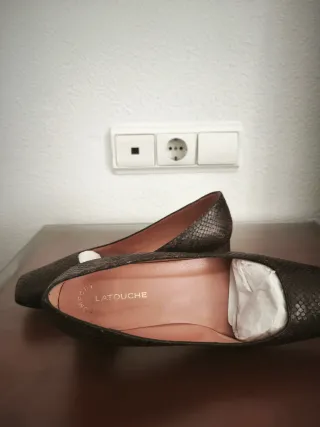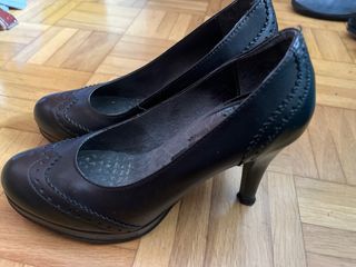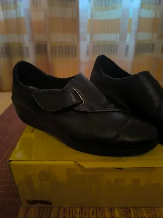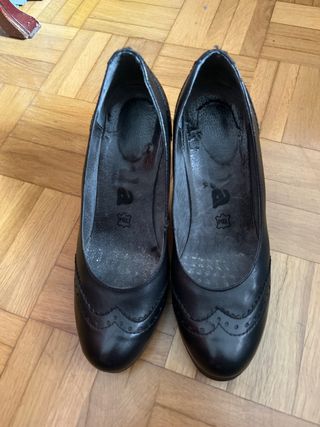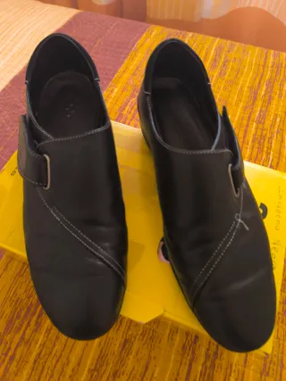 Elegantes zapatos de piel en color negro de la marca ANTEA. Material exterior de ante y acabado brillante en la punta. El tacon es ancho y comodo y el corte del zapato se adapta a cualquier estilo. Estan sin usar, como se puede ver en las fotos.