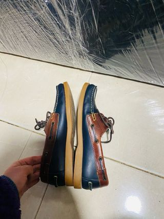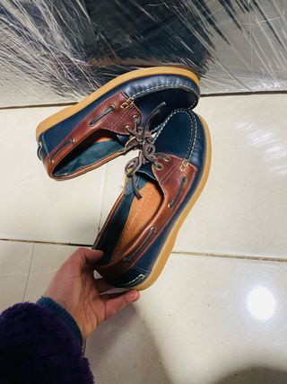 Elegantes zapatos náuticos de piel para hombre. - Combinación de azul y marrón. - Cierre con cordones. - Suela de goma.