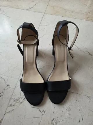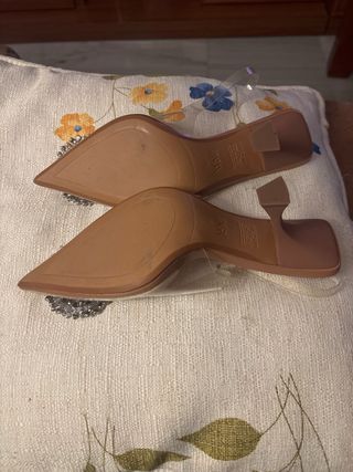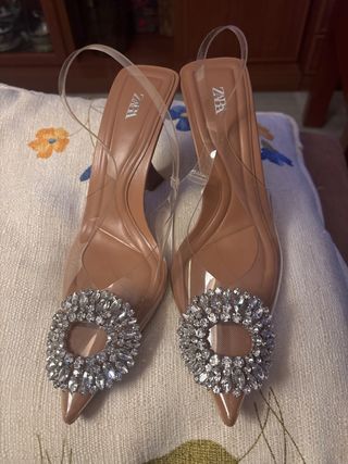 Elegantes zapatos de tacón de Zara. - Diseño con tira transparente. - Adorno circular con pedrería. - Punta fina.
