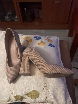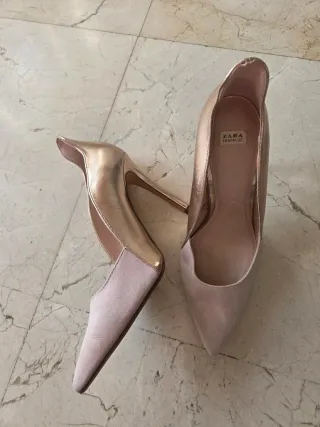 Elegantes zapatos de tacón con un diseño bicolor. - Combinación de ante rosa empolvado y acabado metalizado dorado. - Punta fina. - Marca Zara en la plantilla interior.