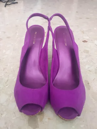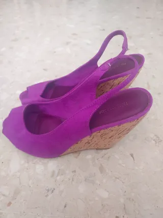 Elegantes zapatos de cuña con diseño peep toe. - Color morado vibrante. - Acabado tipo ante. - Suela de corcho. - Talla 28.