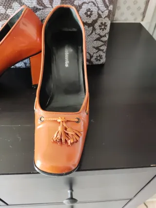 Elegantes zapatos de charol en un llamativo color mostaza. Perfectos para añadir un toque de estilo a cualquier atuendo. - Diseño de tacón grueso. - Adorno de borlas en la punta. - Acabado brillante.