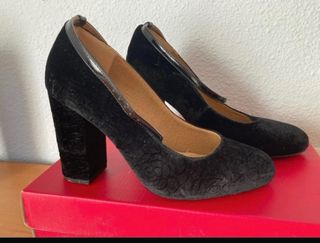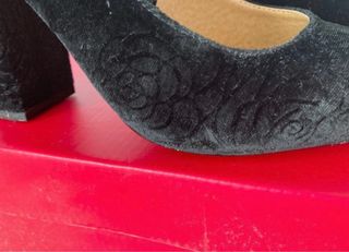 Elegantes zapatos de tacón alto con un delicado diseño floral en relieve. - Material exterior de terciopelo. - Tacón grueso y cuadrado. - Acabado con borde brillante. Usados una vez y poco tiempo.