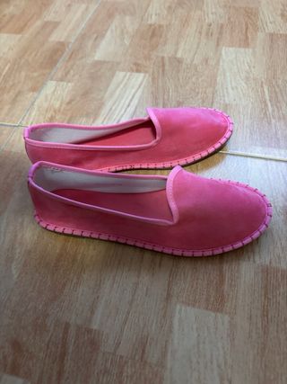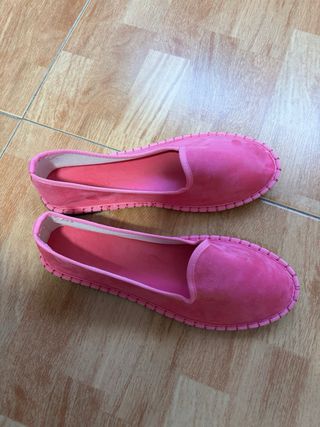 Zapatos planos de estilo merceditas en color rosa. - Diseño de ante. - Ribete decorativo en el borde.