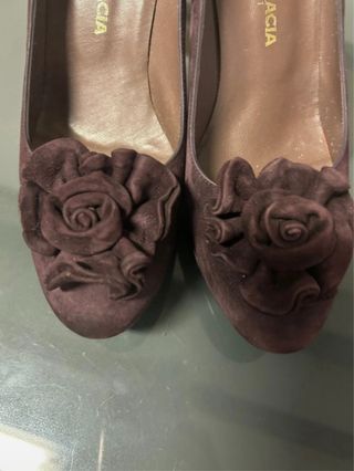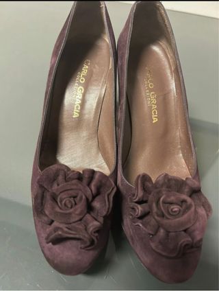 Elegantes zapatos de tacón de ante con un detalle floral. - Marca: Carlo Gracia - Color: Marrón - Material: Ante - Adorno: Flor de tela - Diseño: Zapato cerrado de tacón