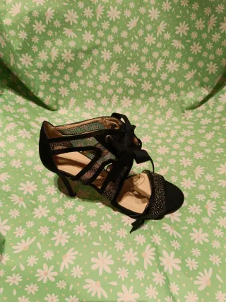Elegantes zapatos de fiesta, usados una sola vez. - Diseño con tiras adornadas con pedrería. - Combinación de tonos azules y plateados. - Cierre de hebilla para un ajuste seguro.