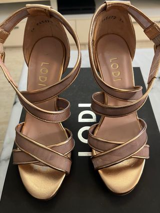 Elegantes sandalias de tacón Lodi de piel. Tacón de 9 cm. - Color dorado. - Talla 36. - Diseño con tiras cruzadas. - Cierre de hebilla.