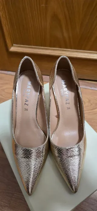 Elegantes zapatos de tacón con un acabado metalizado en tono dorado. Perfectos para añadir un toque de brillo a cualquier ocasión. - Diseño de punta fina. - Tacón de aguja. - Detalle de textura imitando piel de serpiente. - Medida del tacón 9,5 cm.