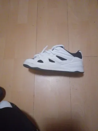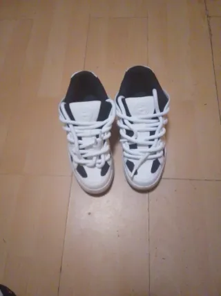 Par de zapatos con un diseño moderno y llamativo. - Combinación de colores blanco y negro. - Cordones blancos. - Suela blanca.